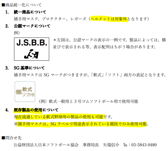 日本ソフトボール協会と全日本軟式野球連盟が、捕手用マスク・プロテクター・レガーズの軟式野球とソフトボール兼用商品の販売を承認することとなりました。
